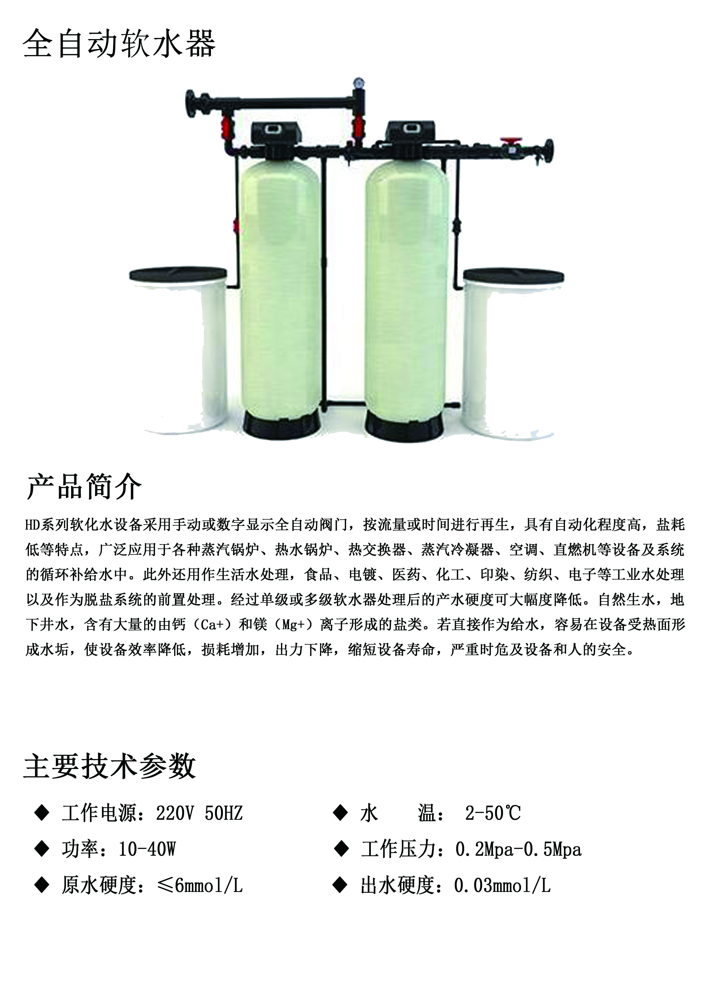 HD系列軟化水設(shè)備采用手動或數(shù)字顯示全自動閥門,按流量或時間進行再生,具有自動化程度高,鹽耗低等特點,廣泛應用于各種蒸汽鍋爐、熱水鍋爐、熱交換器、蒸汽冷凝器、空調(diào)、直燃機等設(shè)備及系統(tǒng)的循環(huán)補給水中。此